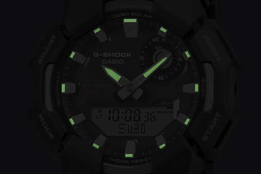 An accelerometer, Bluetooth and a solar panel—all of these are additions to the GA-B010 compared to the aforementioned predecessor. Logically, you’d expect it to be a bit larger, as these technologies take up space in the case. The opposite is true. Casio positioned this as a sport watch, so they wanted it compact. As a result, they reduced the overall dimensions.