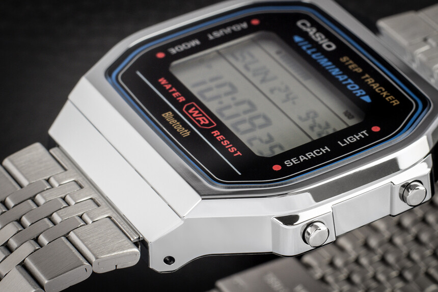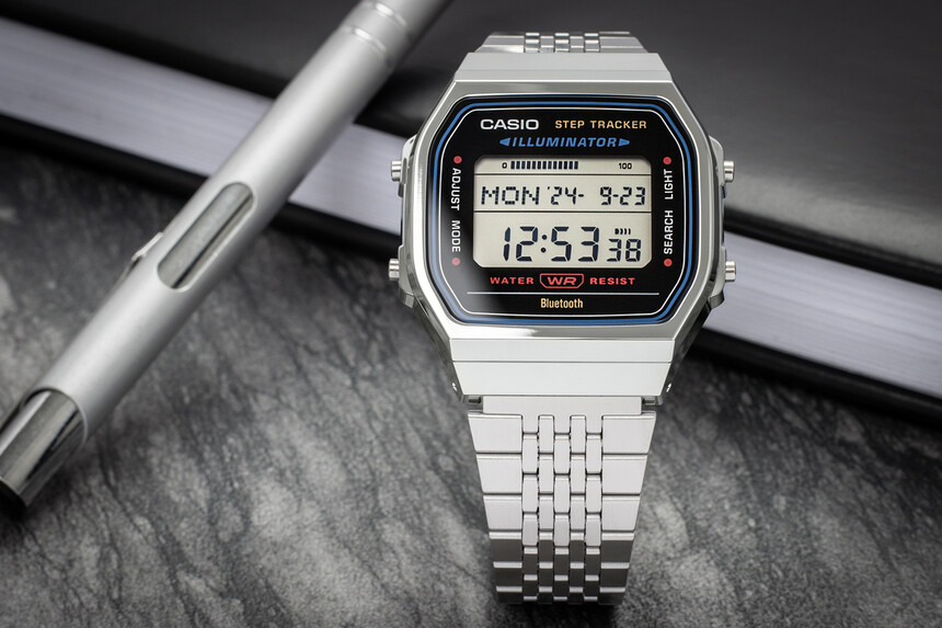 Beyond the expected stopwatch, countdown and backlight, it also offers a step counter and Bluetooth.