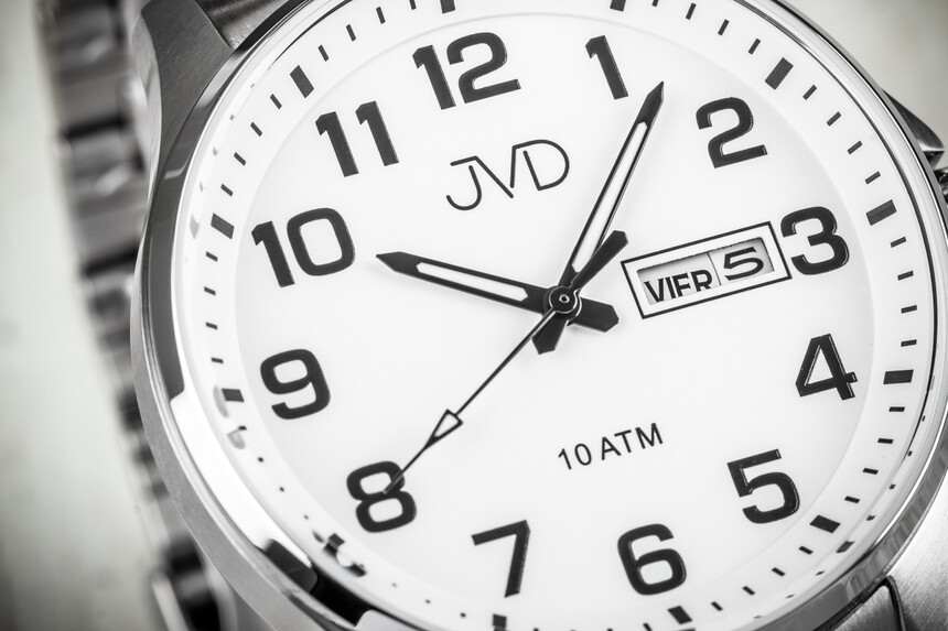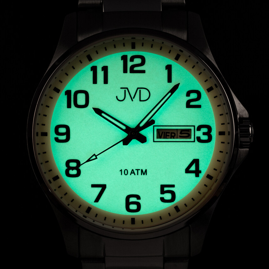 Large, clear numerals, minute markers, high-contrast hands, lume, and a date window—that’s what you get with JVD. The case is stainless steel, on the larger side, and offers 100 m water resistance, so everyday water contact won’t be an issue. You also get a day display.