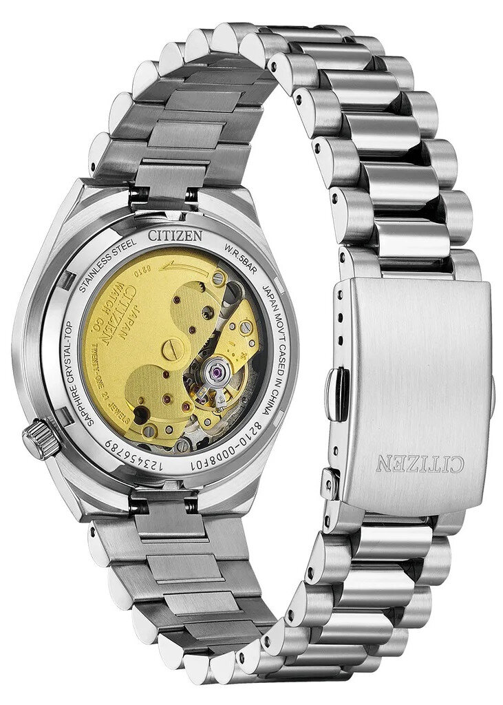 Mechanical with automatic winding. Citizen 8210, Power reserve 45h, 21.600 BPH (3Hz), 21 stones