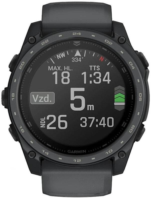 Automatic altitude adjustment Auto start/end dive Automatically saves dive entry and exit locations Safety stop No-fly time Surface diver status widget Depth stops Dive ascent/descent rate indicator Adjustable conservatism Dive planner PO2 Nitrox support Backlight Tide APNOEA mode Single-gas mode Sync dive log to Garmin Dive™ mobile app 3-axis dive compass Missed decompression lockout Custom end-dive timeout