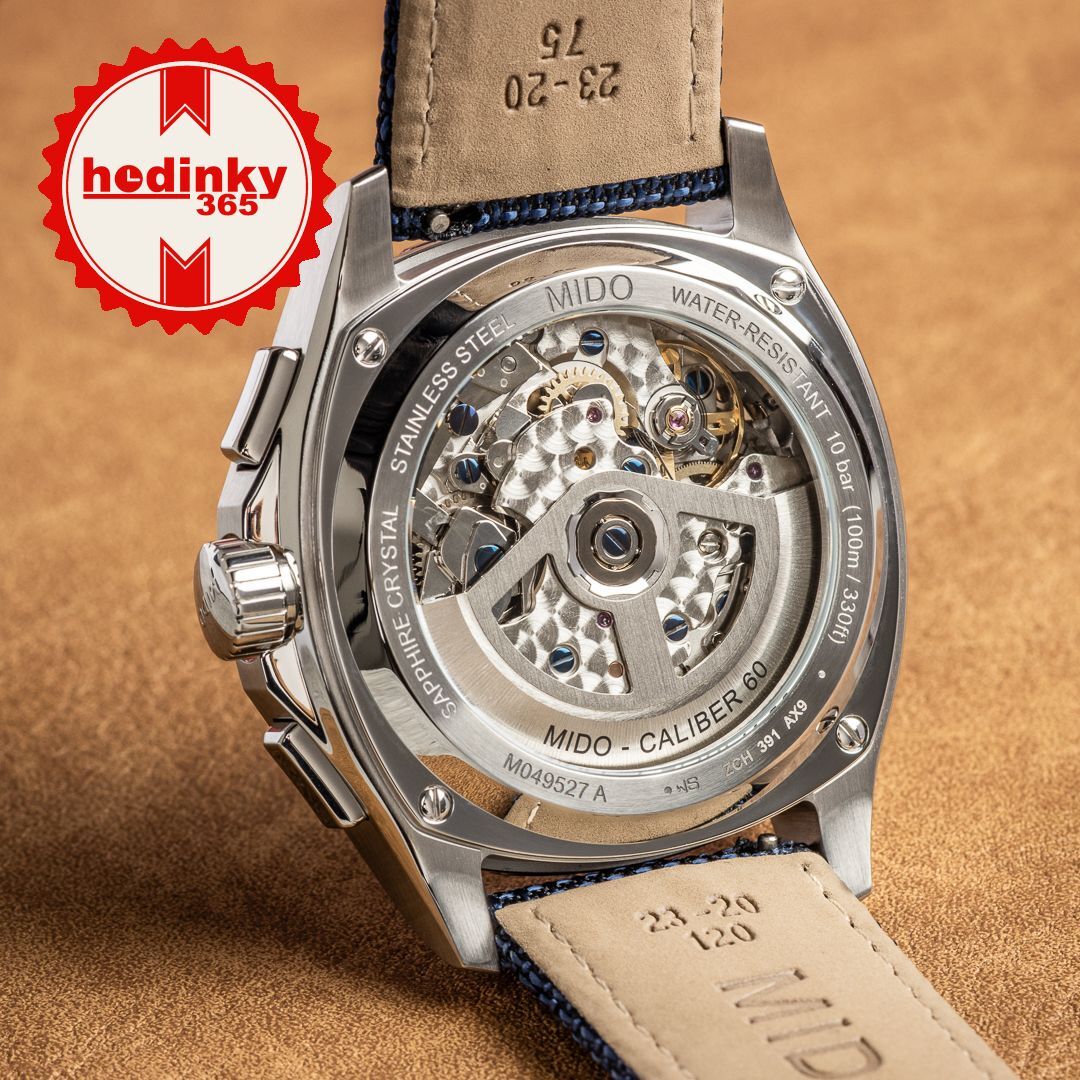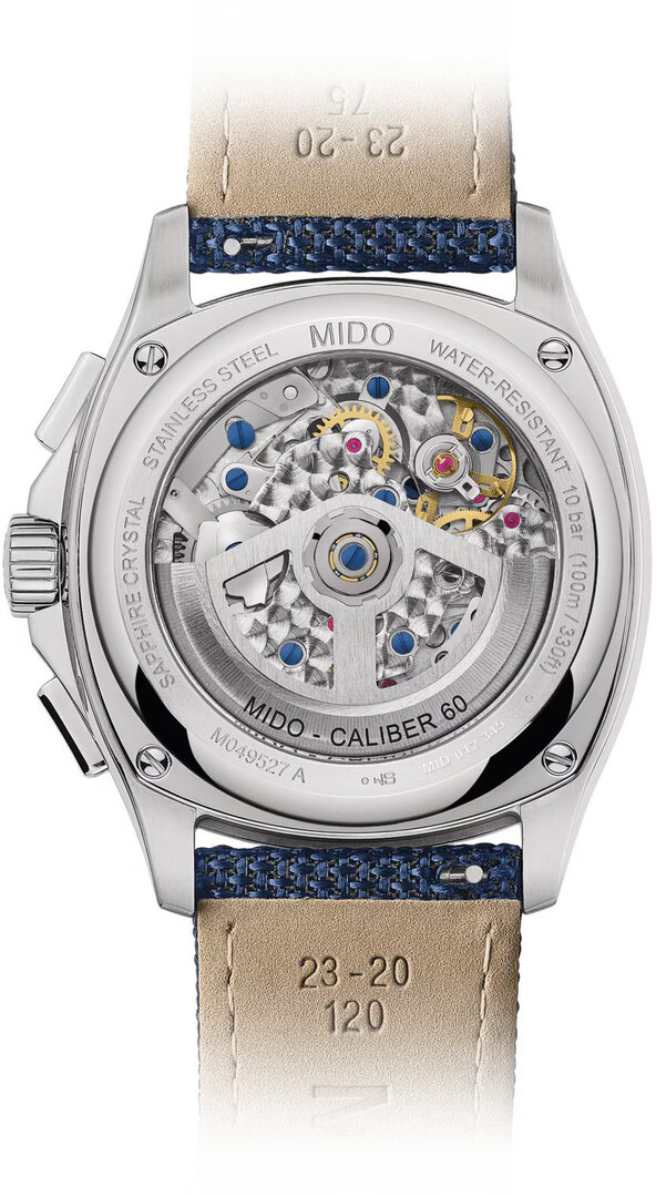 Mechanical with automatic winding. Mido Caliber 60 placed on ETA/Valjoux A05.H31 placed on ETA/Valjoux 7753 placed on ETA/Valjoux 7750, Power reserve 60h, 28.800 BPH (4Hz), 27 stones
