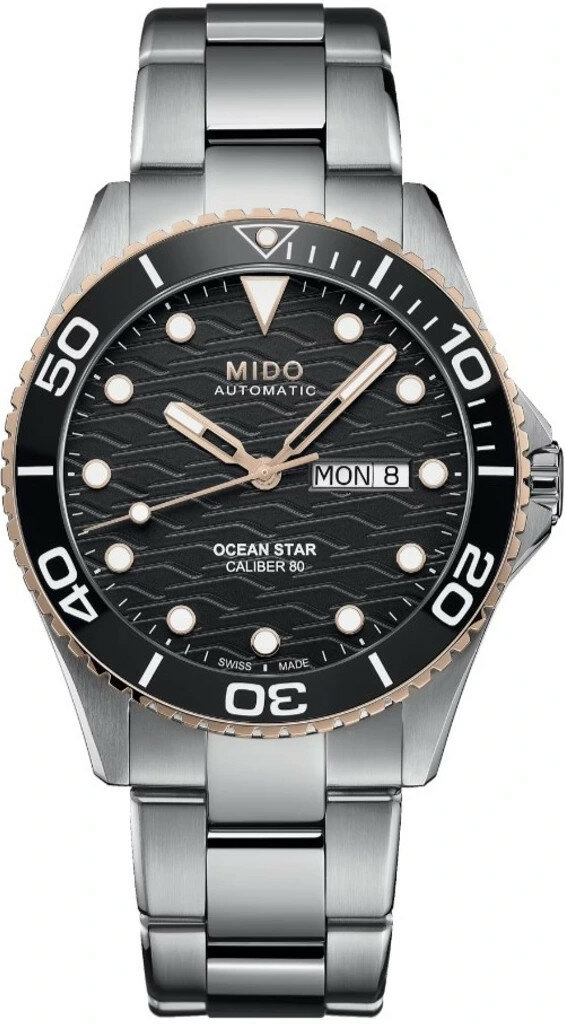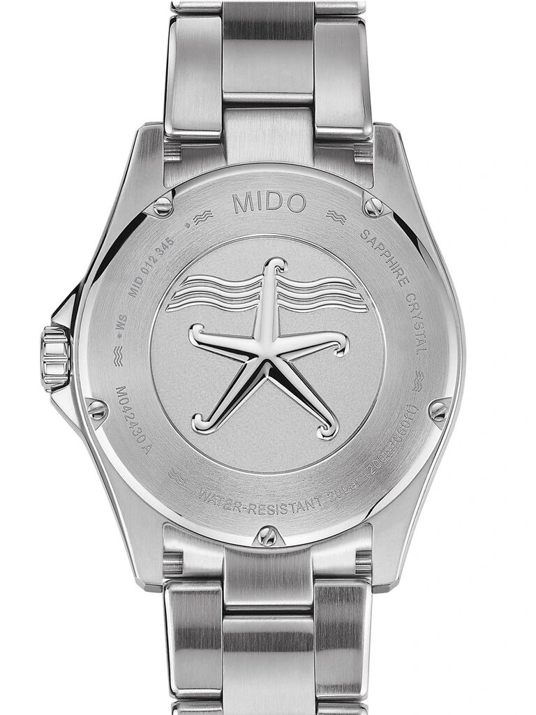 Mechanical with automatic winding. Mido Caliber 80 placed on ETA C07.621 placed on ETA 2836-2 placed on ETA 2824-2, Power reserve 80h, 21.600 BPH (3Hz), 25 stones