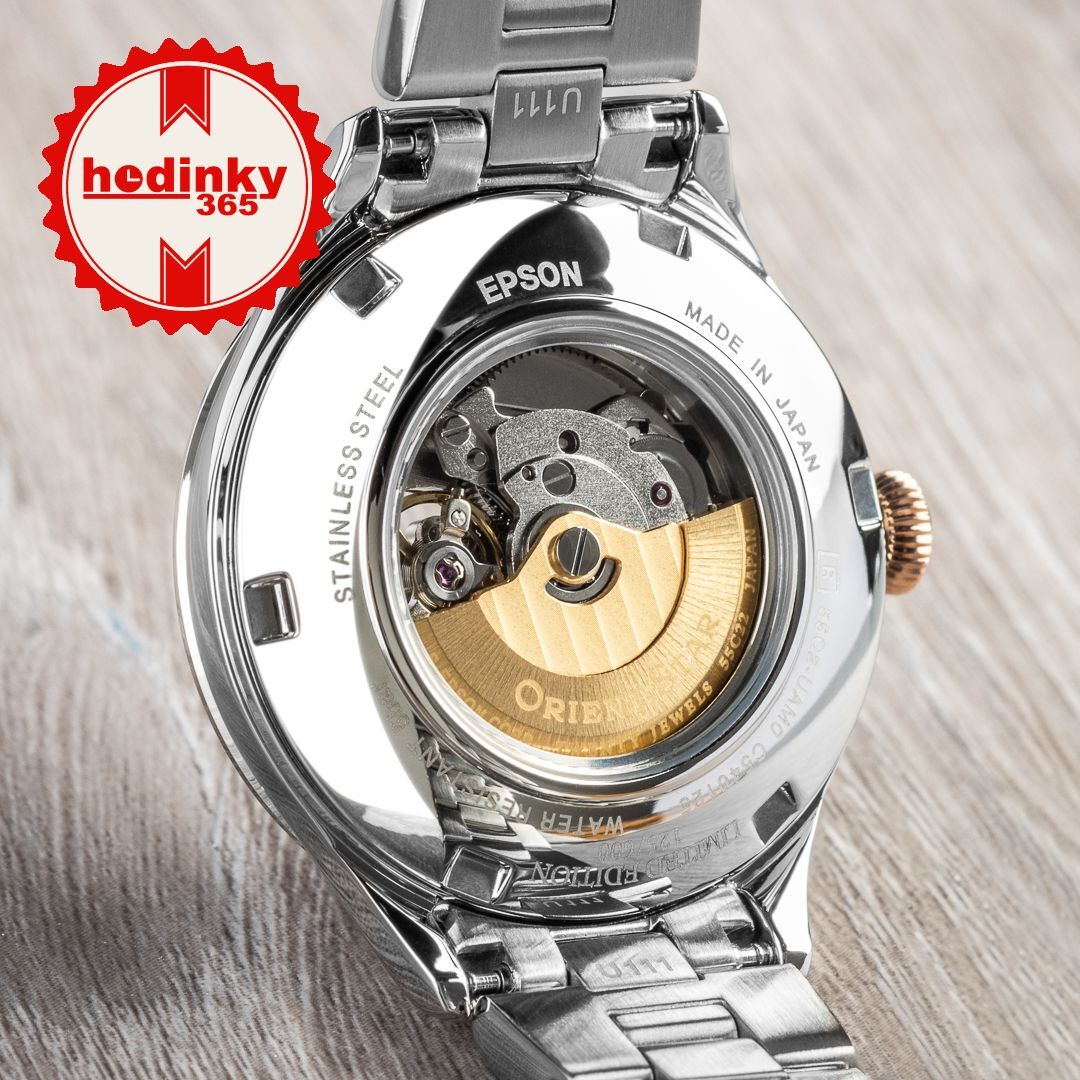 Mechanical with automatic winding. Orient 55C22, Power reserve 40h, 21.600 BPH (3Hz), 20 stones, Hand winding function