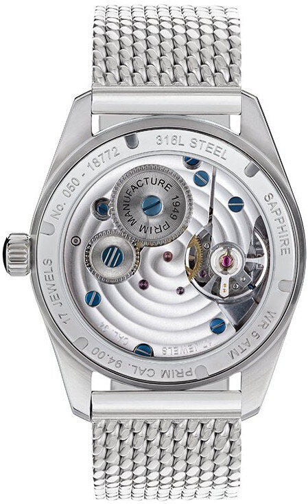 Mechanical with manual winding. PRIM Kalibr 94.00, Power reserve 48h, 21.600 BPH (3Hz), 17 stones